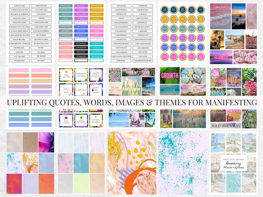 Our printable pdfs are perfectly packed with magical manifestation tools to help get you started on creating your first vision board, teeming with gorgeous gems such as, intentional worded phrases, inspiring quotes, dreamy images, beautifully printed backgrounds and graphics, manifestation cheques and lots more to be found within.